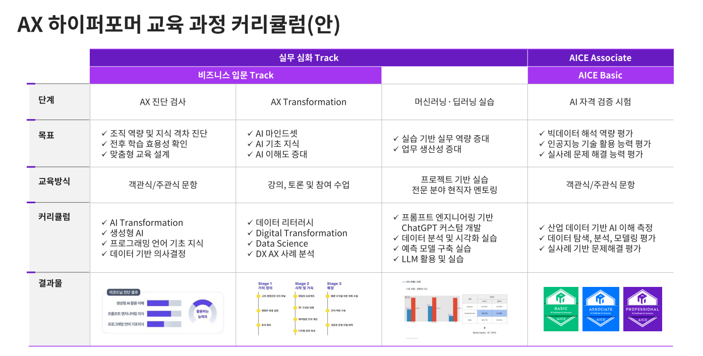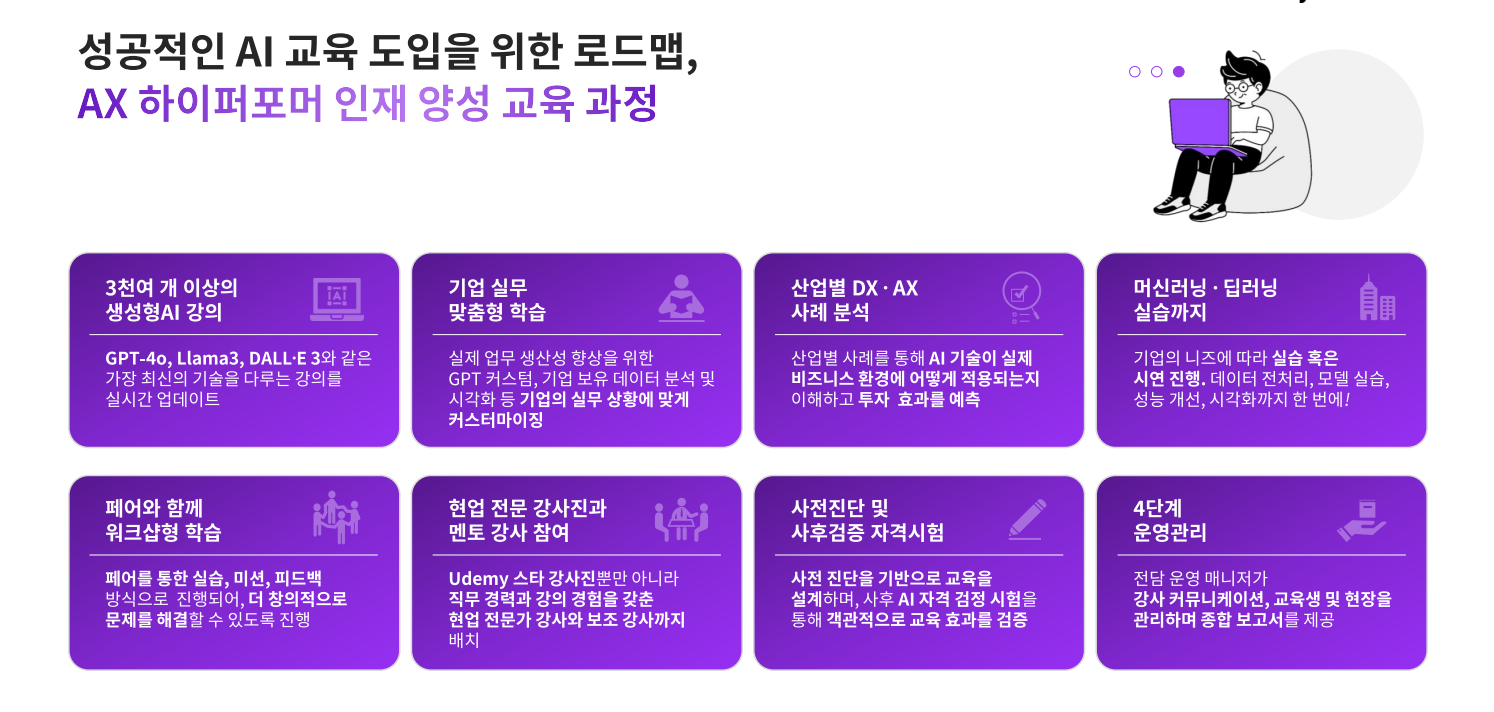 업무에 바로 활용할 수 있는 AI 활용 능력, AX 역량은 어떻게 키울 수 있을까요? ‘맞춤형 교육’을 통해 가능합니다. 현업에서 업무를 수행 중인 실무자의 다양한 상황을 고려하여 이에 걸맞게 구성한 교육이죠.