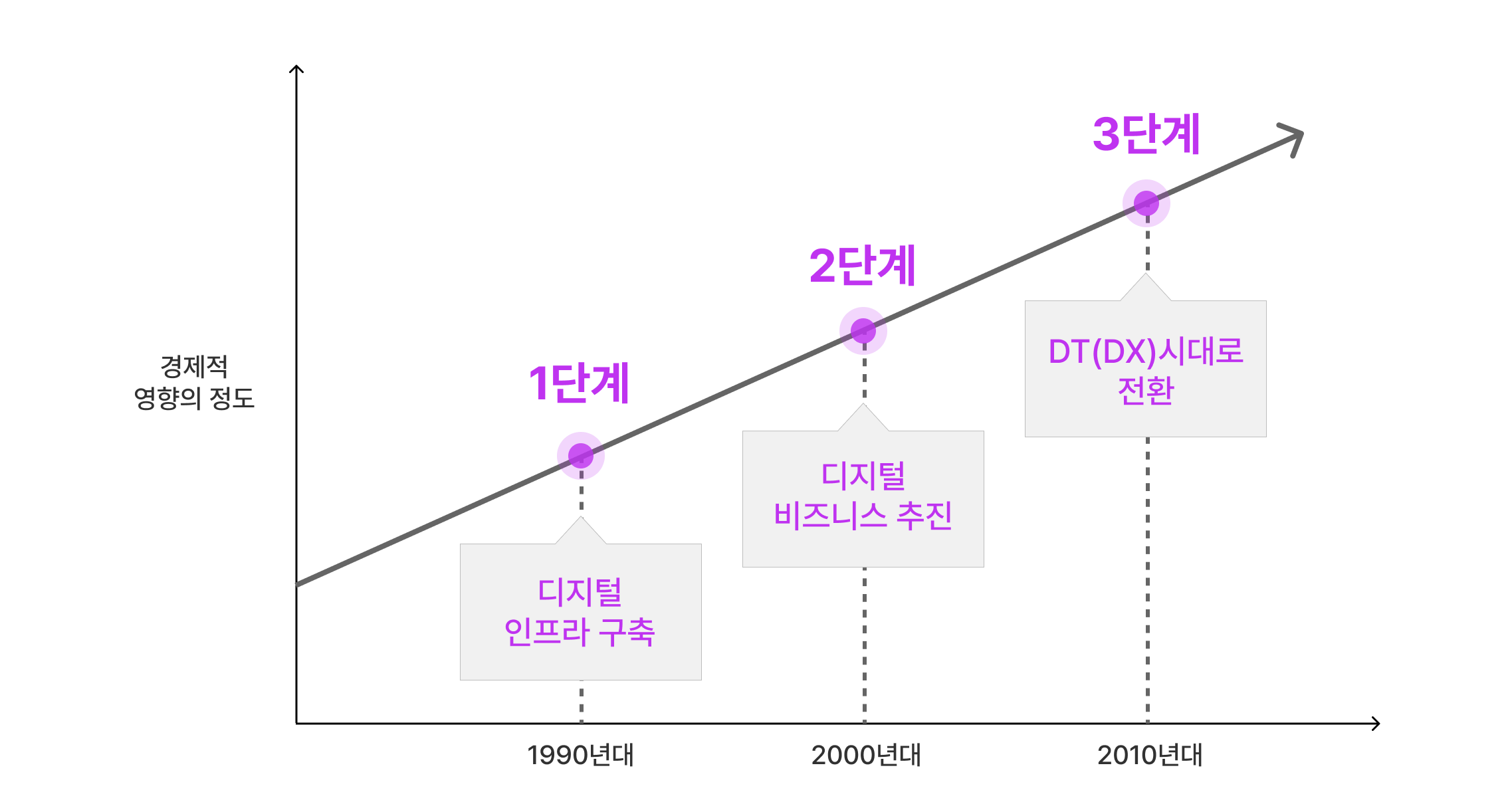 1990년대 말, 인터넷이 도입되면서 서버나 네트워크 등 디지털 인프라가 구축되던 시기를 디지털 인프라 구축 단계라 부릅니다. 2000년대 초에는 인터넷과 이커머스가 대중화되며 많은 기업이 디지털 분야의 비즈니스 모델을 추진하기 시작했죠. 그러다 2010년대가 시작되며 빅데이터나 인공지능 등의 기술이 고도화되며 기업 내 구조에 변화가 찾아왔습니다. 채용이나 교육, 프로세스, 전략 등 경영에 필요한 모든 것들을 디지털로 전환했어요. 최근 코로나라는 주요한 변곡점 이후로 DT는 모든 기업의 필수 생존 전략이 되었습니다.