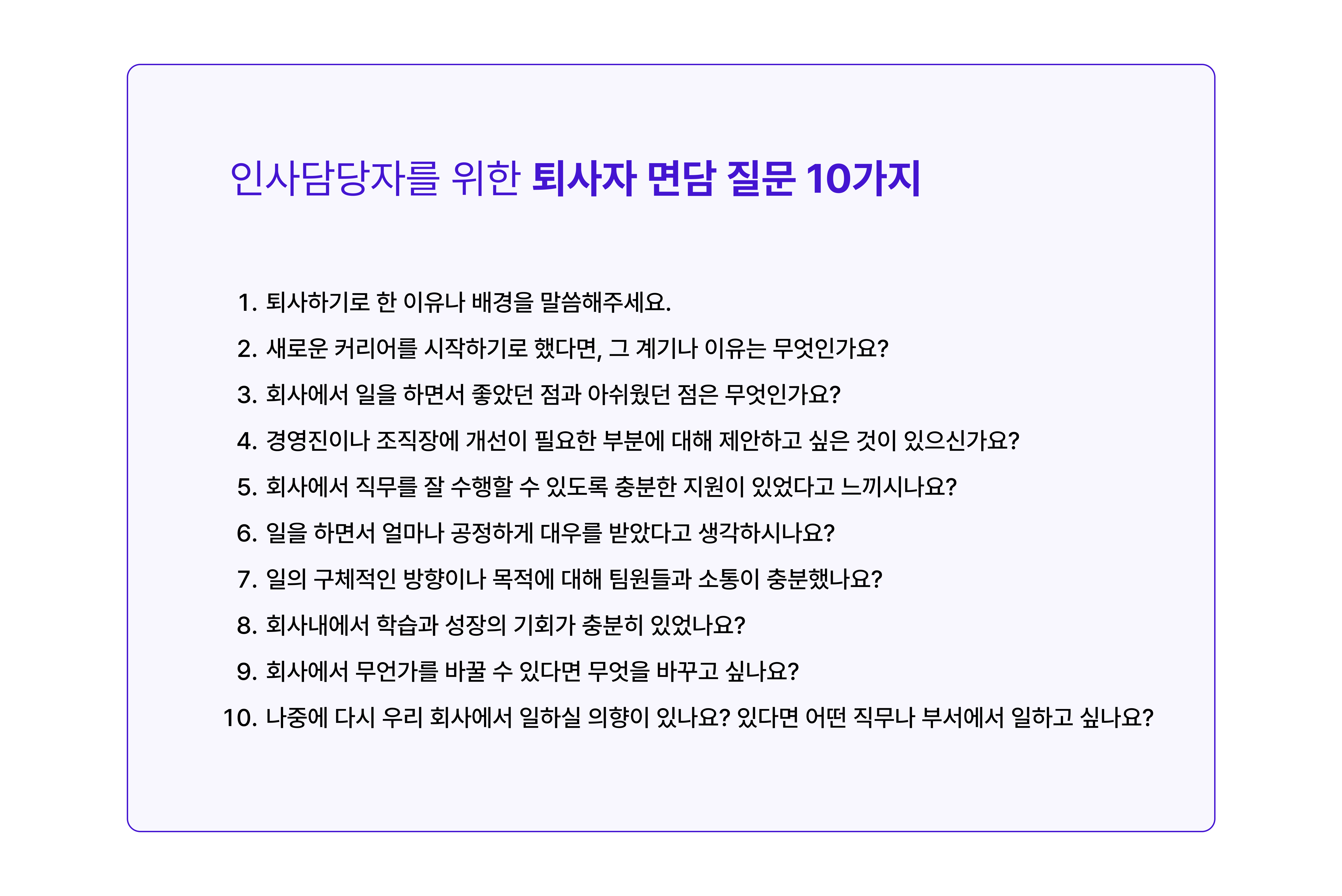 파타고니아의 사례에서 알 수 있듯, 이제 퇴사라는 과정은 단순히 사직서를 제출하는 것이 아닌 회사와 직원이 서로를 위해 건설적인 비판을 할 수 있는 결정적인 순간입니다. 퇴사자 면담을 통해 얻은 피드백을 바탕으로 회사는 더 나은 직원 경험을 만들 수 있으며, 향후 기업 평판에도 긍정적인 영향을 미칠 수 있기 때문입니다. 대퇴사 시대의 인사관리자로 퇴사자 면담을 고민하고 있다면 아래 질문 10가지를 참고해 면담 제도를 기획해 보기를 추천합니다.